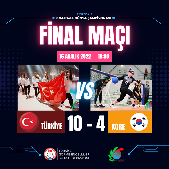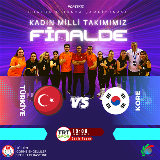 Kadın milli takımımız, Goalball Dünya Şampiyonası yarı finalinde karşılaştığı İsrail'i 4-2 mağlup ederek adını finale yazdırdı.Milli takımımız şampiyonluk maçında yarı finalde Kanada karşısında 5-2 üstünlük sağlayan Kore ile mücadele edecek. 16 Aralık (bugün) Türkiye saatiyle 19:00'da gerçekleşecek Goalball Dünya Şampiyonası finali TRT SPOR’dan canlı yayınlanacak.